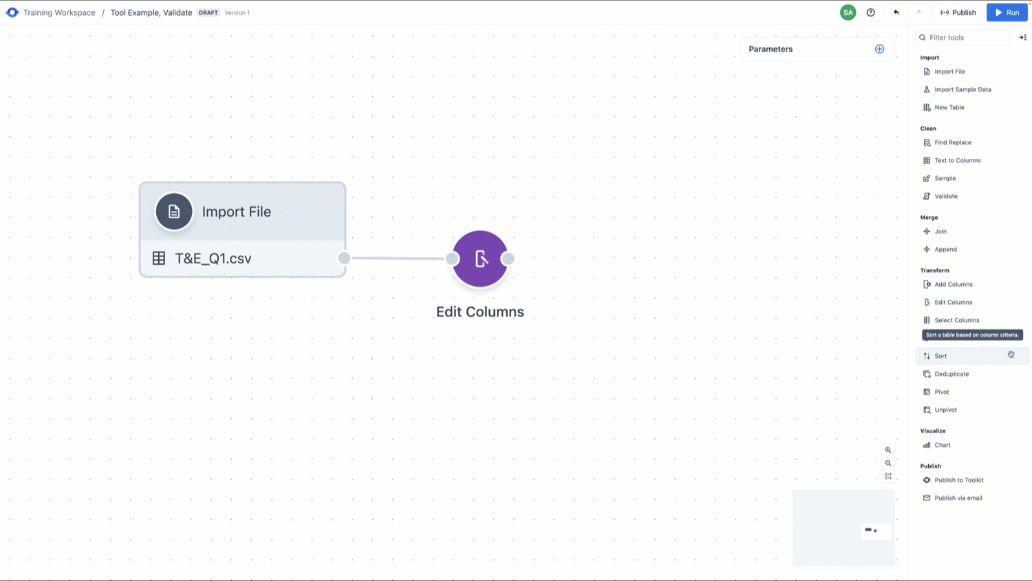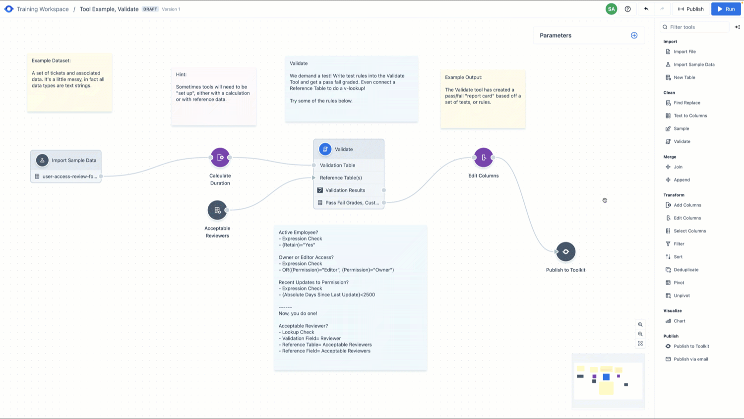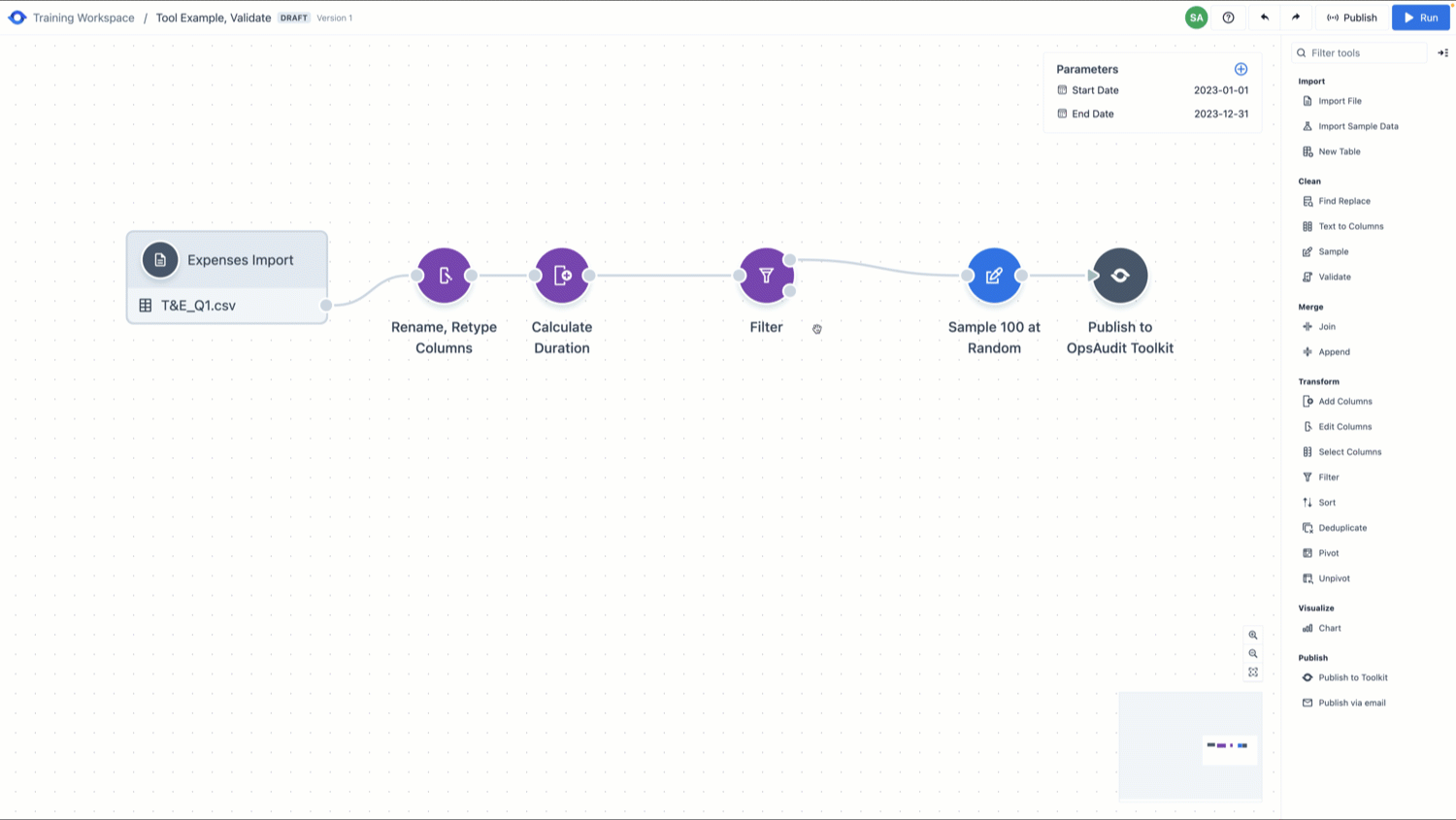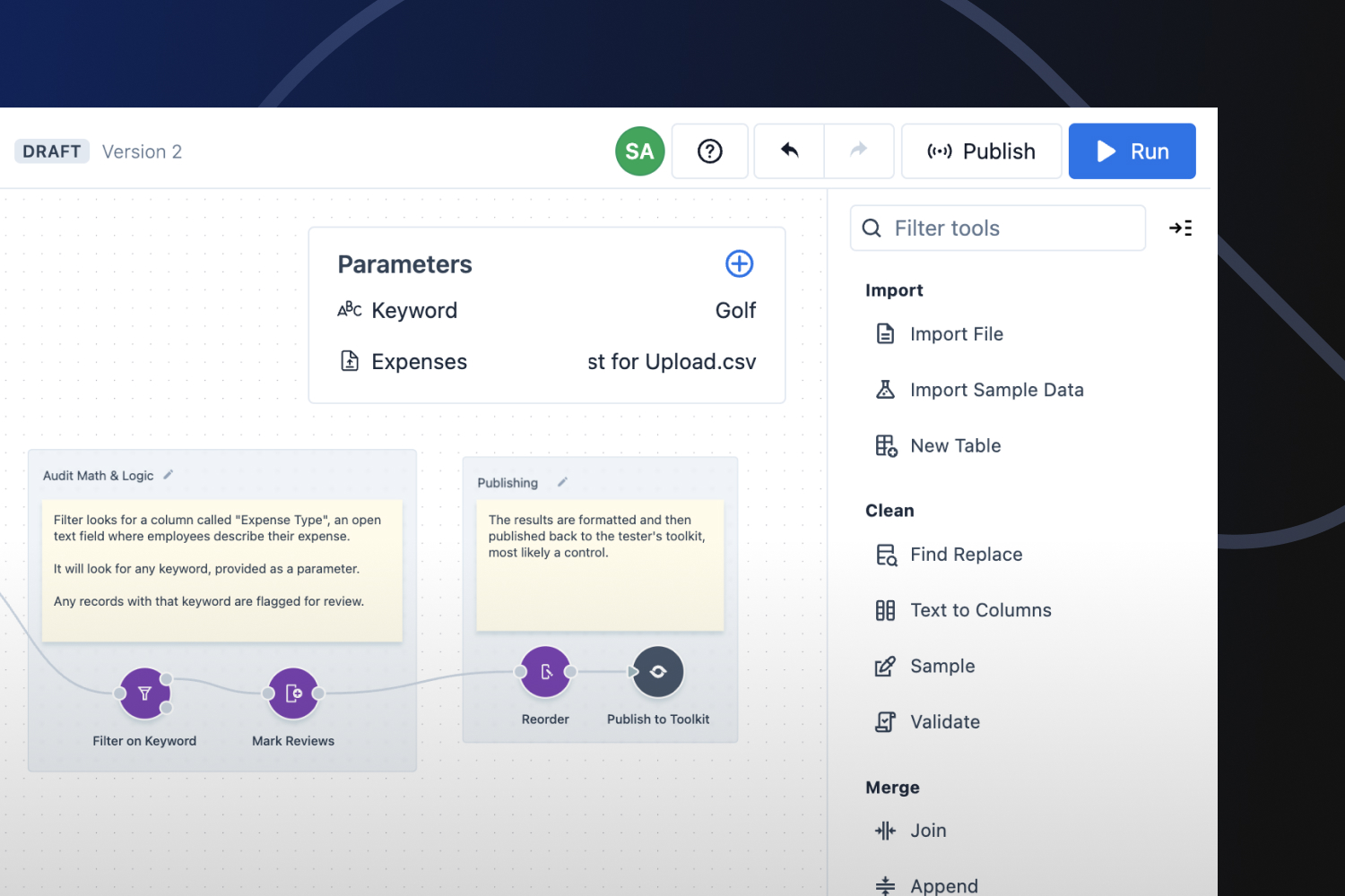 Tools are grouped in the tool menu based on common functionality. These groupings include [Import](https://docs.auditboardanalytics.com/tools/import), [Clean](https://docs.auditboardanalytics.com/tools/clean), [Merge](https://docs.auditboardanalytics.com/tools/merge), [Transform](https://docs.auditboardanalytics.com/tools/transform), [Visualize](https://docs.auditboardanalytics.com/tools/visualize), and [Publish](https://docs.auditboardanalytics.com/tools/publish). When dropped onto the canvas, a tool’s color is defined by the functional group it came from to easily interpret different functions within workflows.