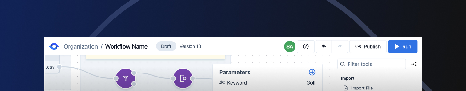 Data is imported and processed through tools only when a workflow is *run*. When a workflow is *run*, the workflow sequentially carries out the logic of the tools configured on the canvas.