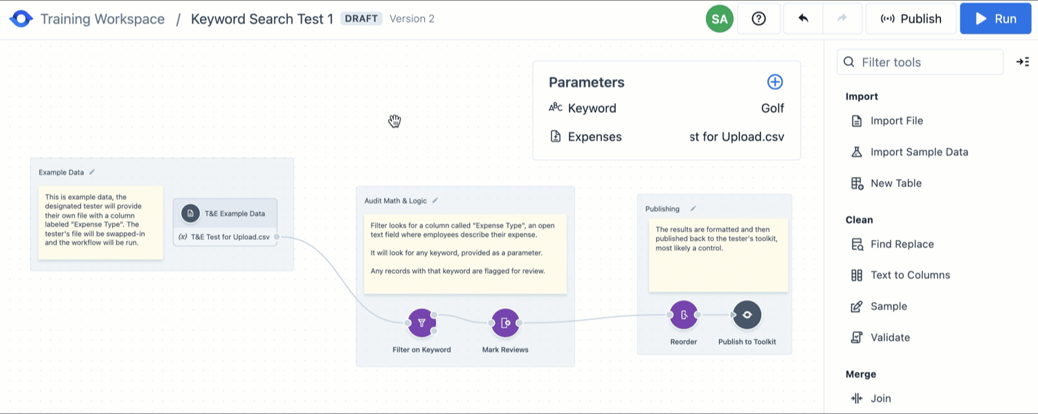The Publish button in the top-right corner will publish an updated version of your workflow to AuditBoard Automations. This is generally done when a workflow is complete, and is ready for independent testing and verification.