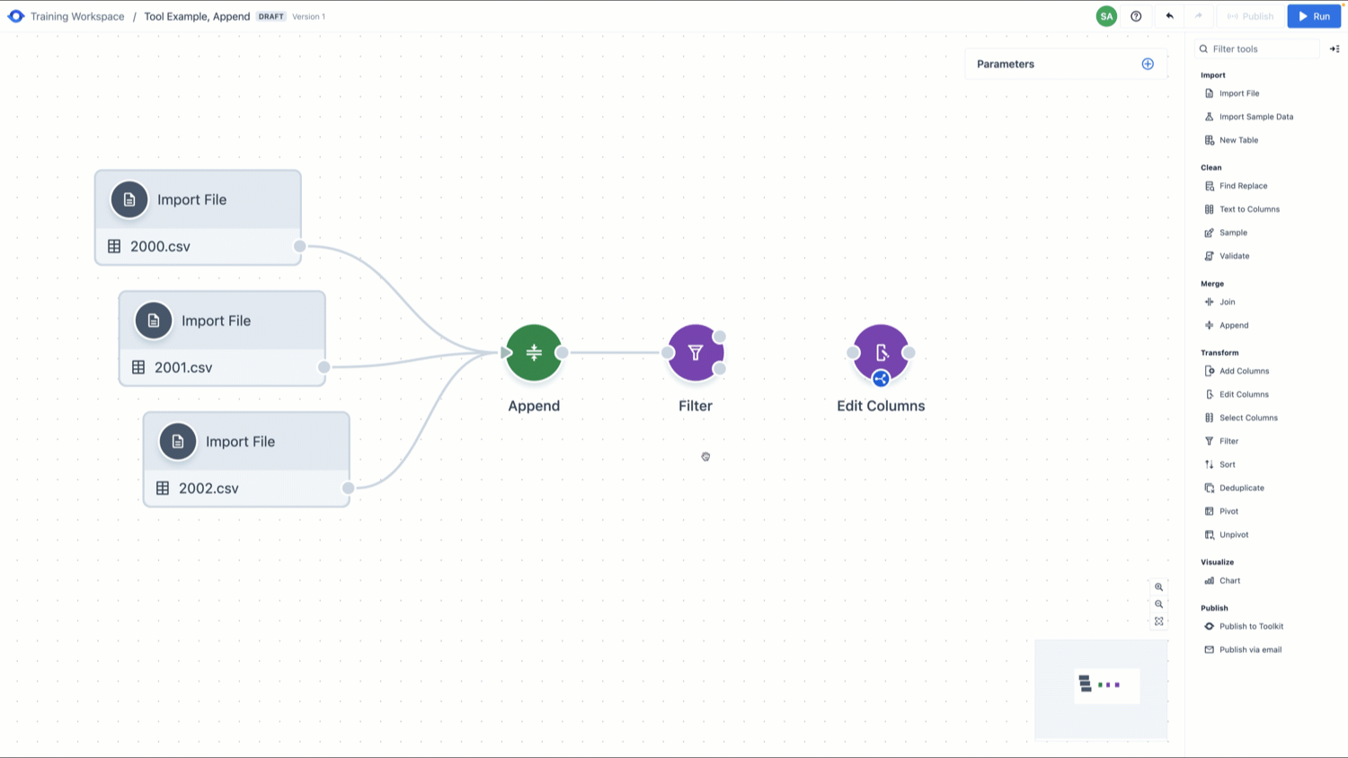 Tools with a triangle input handle, like the Append tool, can accept multiple connections.